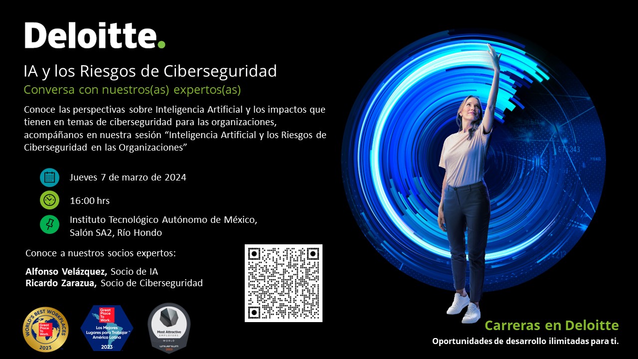 Deloitte en conjunto con la Oficina de Career Services del ITAM te invita a su taller de empleabilidad “Inteligencia Artificial y los riesgos de ciberseguridad en organizaciones", dirigido a todos los alumnos de 5º semestre en adelante y exalumnos de las licenciaturas en Actuaría, Ciencia de Datos y Matemáticas Aplicadas y de las ingenierías en Computación, Industrial, Mecatrónica y Negocios.